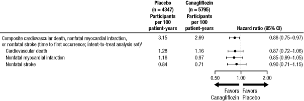 Chez les patients souffrant de diabète de type 2 et présentant une maladie cardiovasculaire établie ou au moins 2 facteurs de risque de maladie cardiovasculaire, la canagliflozine a été associée à une augmentation du risque d’amputation des membres inférieurs, tel qu’observé dans le programme intégré CANVAS, comprenant CANVAS et CANVAS-R, deux essais de grande ampleur, de longue durée, randomisés, contrôlés contre placebo visant à évaluer 10 134 patients adultes. Le déséquilibre s’est produit dés les 26 premières semaines de traitement. Les patients des essais CANVAS et CANVAS-R ont été suivis pendant une moyenne de respectivement 5,7 et 2,1 ans. Indépendamment du fait que le traitement soit la canagliflozine ou le placebo, le risque d’amputation était supérieur chez les patients ayant un antécédent d’amputation, de maladie vasculaire périphérique ou de neuropathie. Le risque d’amputation des membres inférieurs n’était pas dose-dépendant. Les résultats relatifs à l’amputation du programme intégré CANVAS sont présentés par le tableau 3.