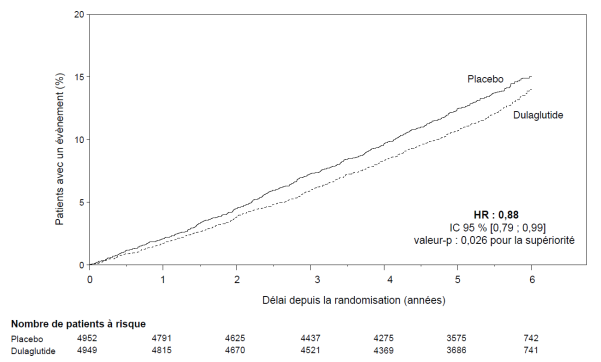 Le profil de sécurité observé chez les patients traités par dulaglutide aux doses hebdomadaires de 3 mg et 4,5 mg est cohérent avec celui décrit ci-dessus pour le dulaglutide aux doses hebdomadaires de 0,75 mg et 1,5 mg.