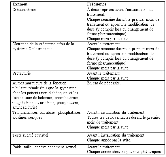 | Peu fréquent : | Trouble de la fonction tubulaire rénale2 (syndrome de Fanconi acquis), glycosurie |