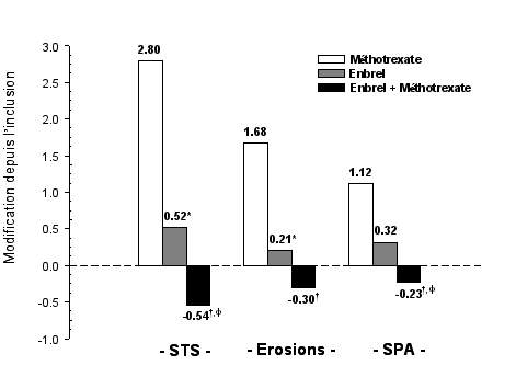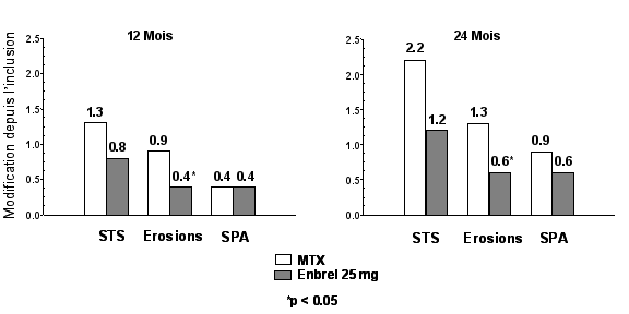 Il a été montré qu’Enbrel, seul ou en association avec le méthotrexate, ralentit la progression des dommages structuraux articulaires tels que mesurés par la radiographie et améliore les capacités fonctionnelles.