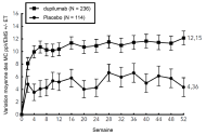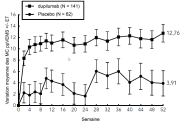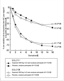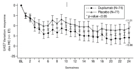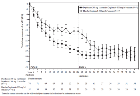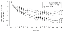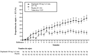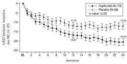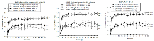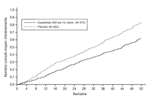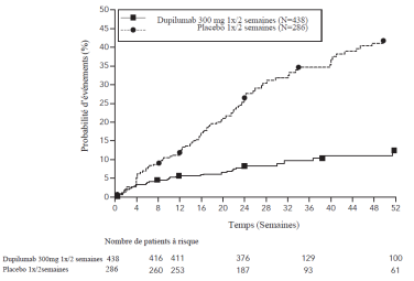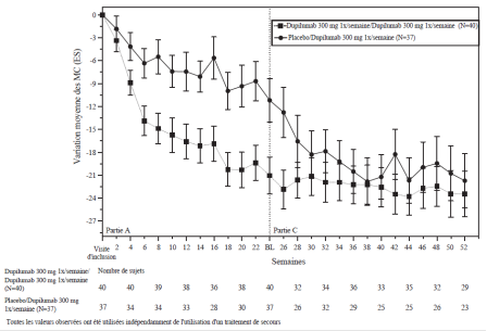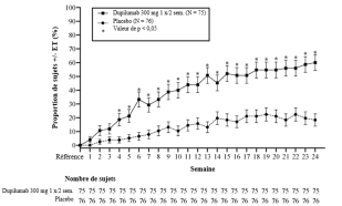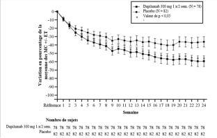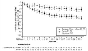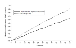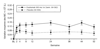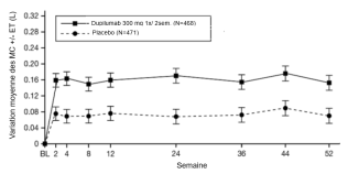 Les patients traités par le dupilumab ont initialement présenté une augmentation moyenne de leur taux d’éosinophiles par rapport à leur taux à l’inclusion dans l’étude supérieure à celle du groupe placebo dans les indications de dermatite atopique, d’asthme, de polypose naso-sinusienne, de BPCO et d’UCS. Les taux d’éosinophiles ont ensuite diminué au cours de l’étude, revenant quasiment à leurs valeurs à l’inclusion dans l’étude. Les taux d’éosinophiles sont revenus à leurs valeurs à l‘inclusion au cours de l’étude de tolérance d’extension en ouvert conduite dans l’asthme (TRAVERSE). Le taux sanguin moyen d’éosinophiles a diminué jusqu’à être inférieur à sa valeur à l’inclusion à la semaine 20 et a été maintenu jusqu’à 5 ans dans l’étude à long terme OLE (AD-1225). Comparé au placebo, aucune augmentation du taux moyen d’éosinophiles sanguins n’a été observée dans le PN (études PRIME et PRIME2). Les taux d’éosinophiles moyens et médians chez les patients atteints d’œsophagite à éosinophiles sous traitement à l’étude ou chez ceux atteints de BPCO (études BOREAS et NOTUS) ont baissé jusqu’à se rapprocher de leurs taux à l’inclusion ou sont restés à des taux inférieurs à ceux de l’inclusion.