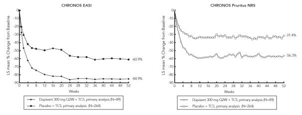 Le profil de tolérance du dupilumab + CST (CHRONOS) chez les patients adultes présentant une dermatite atopique suivis jusqu’à la semaine 52 était similaire au profil de tolérance observé à la semaine 16. La tolérance à long-terme du dupilumab a été évaluée dans une étude d’extension en ouvert chez des patients âgés de 6 mois à 17 ans présentant une dermatite atopique modérée à sévère (AD-1434). Le profil de tolérance du dupilumab chez les patients suivis jusqu’à la semaine 52 était similaire au profil de tolérance observé à la semaine 16 dans les études AD-1526, AD-1652 et AD-1539. Le profil de tolérance à long terme du dupilumab observé chez les enfants et les adolescents correspondait à celui observé chez les adultes présentant une dermatite atopique.