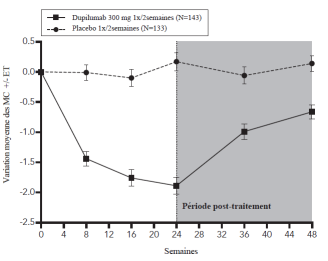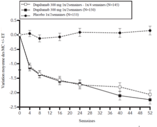 Dupilumab est destiné à un traitement au long cours. L’interruption du traitement doit être envisagée en cas d’absence de réponse après 24 semaines de traitement. Certains patients présentant initialement une réponse partielle peuvent bénéficier d’une amélioration en poursuivant le traitement après 24 semaines.