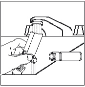 - Wenn der Inhalator seit 5 Tagen oder länger nicht verwendet wurde, schütteln Sie ihn kräftig und geben 2 Sprühstöße in die Luft ab, um seine ordnungsgemäße Funktion sicherzustellen.