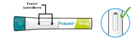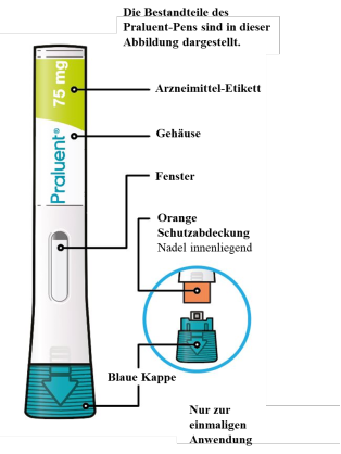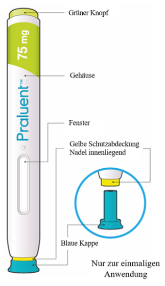 - Dieses Medizinprodukt ist ein Fertigpen zur einmaligen Anwendung. Es enthält 75 mg Praluent (Alirocumab) in 1 ml Lösung.