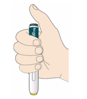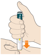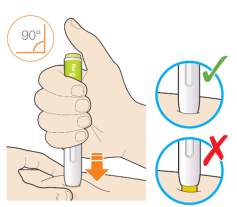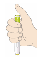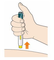 - Drücken Sie den Fertigpen gegen Ihren Körper und halten Sie ihn dort fest gedrückt, bis die gelbe Sicherheitsabdeckung nicht mehr sichtbar ist (siehe Abbildung).
