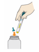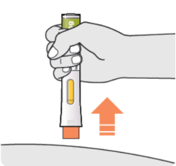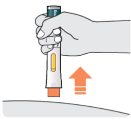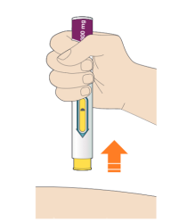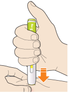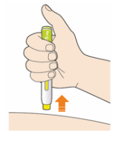 a Drücken Sie den Fertigpen senkrecht gegen Ihre Haut bis die orange Schutzabdeckung vollständig in den Pen eingedrückt ist und halten Sie ihn fest.