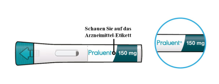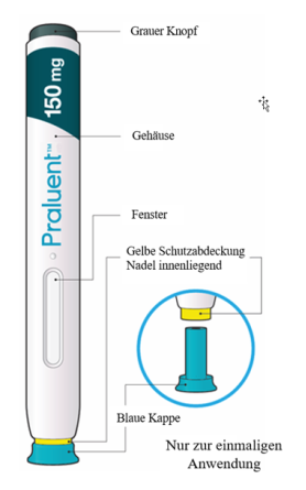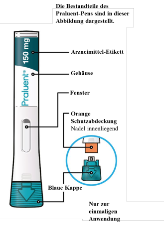 - Dieses Medizinprodukt ist ein Fertigpen zur einmaligen Anwendung. Es enthält 150 mg Praluent (Alirocumab) in 1 ml Lösung.