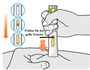 b Wenn Sie die gelbe Schutzabdeckung auf Ihre Haut setzen, halten Sie den Fertigpen so, dass Sie das Fenster sehen können.