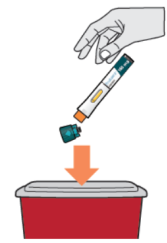 - Entsorgen Sie den Fertigpen und die Kappe unmittelbar nach der Anwendung in ein durchstichsicheres Behältnis.