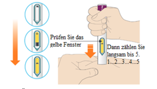 Wenn das Fenster nicht vollständig gelb wird, entfernen Sie den Fertigpen und wenden Sie sich an den örtlichen Vertreter des pharmazeutischen Unternehmers.
