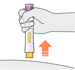 a Drücken Sie den Fertigpen senkrecht gegen Ihre Haut bis die gelbe Schutzabdeckung vollständig in den Pen eingedrückt ist und halten Sie ihn fest.