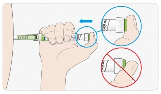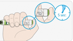 - Laat, na het ingedrukt houden en langzaam tot 5 tellen, de injectieknop los. Trek vervolgens de naald uit uw huid.