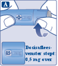 Alleen het dosisafleesvenster en de dosisaanwijspijl geven aan dat 0,5 mg is ingesteld. | ||