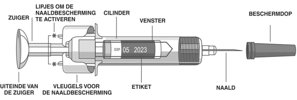 - Injecteer de dosis direct nadat de beschermdop van de naald is verwijderd.