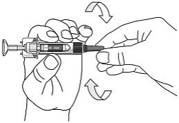 - Houd de voorgevulde spuit vast aan de cilinder en zorg ervoor dat de naald met beschermdop naar beneden wijst.