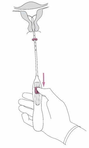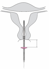 4. Terwijl u de glijder in de verste positie houdt, steekt u het insertiebuisje door de cervix tot de ring ongeveer 1,5-2,0 cm van de baarmoederhals verwijderd is. | |