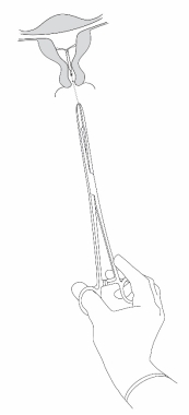 - Steek een uterussonde via het cervicale kanaal tot in de fundus om de diepte te meten, om de richting van de baarmoederholte te bevestigen en om intra-uteriene afwijkingen op te sporen (bv. septum, submucosale fibromen) of een vroeger spiraaltje dat niet werd verwijderd. Als u moeilijkheden ondervindt, moet worden overwogen om het kanaal te dilateren. Als dilatatie van de cervix vereist is, kunt u pijnstillers en/of een paracervicaal blok gebruiken.