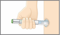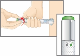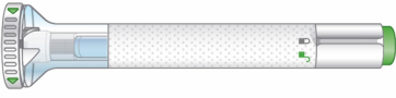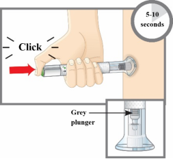 A.  | Sommige patiënten kunnen een zachte klik horen net vóór de tweede harde klik. Dat is normaal. Haal de voorgevulde pen niet van uw huid af voordat u de tweede harde klik hoort.  | |||||||||