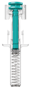 De naald trekt zich terug in de cilinder en wordt ter plekke vergrendeld, zodat de naald uit uw huid wordt verwijderd.