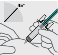 Gebruik uw andere hand om de huid op de injectieplaats samen te knijpen. Plaats de spuit onder een hoek van ongeveer 45 graden op de huid.