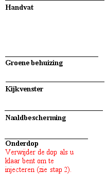 Om de volledige dosis te injecteren, drukt u tijdens de injectie het handvat helemaal naar beneden tot de groene behuizing niet meer zichtbaar is.