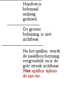 Als u dat wel doet, dan vergrendelt de naaldbescherming. U ziet dan een gele strook en u krijgt niet de volledige dosis.