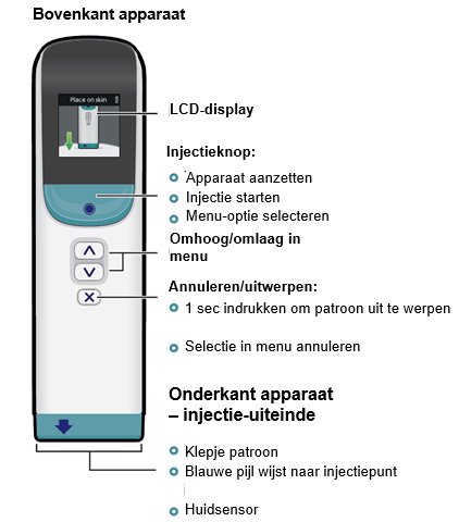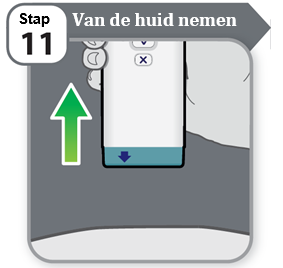 Let op: Als u het apparaat van uw huid afhaalt voordat het display aangeeft dat u dat moet doen, plaats het dan niet terug op de injectieplaats en injecteer geen nieuwe dosis. Neem contact op met uw medische zorgverlener voor advies.