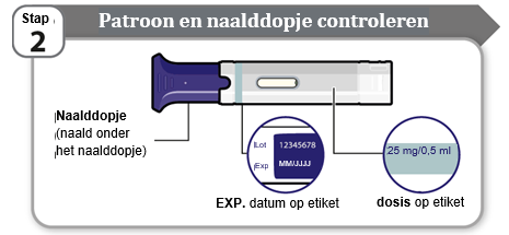 - Controleer de uiterste houdbaarheidsdatum en de dosis die op het etiket staan vermeld. Gebruik de patroon niet als de uiterste houdbaarheidsdatum is verstreken of als de dosis anders is dan de dosis die aan u is voorgeschreven.
