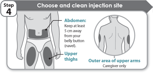 - Kies altijd een gebied op uw buik of de voorkant van uw dijen. Als een zorgverlener de injectie geeft, kan de buitenkant van uw bovenarmen worden gebruikt, anders niet.
