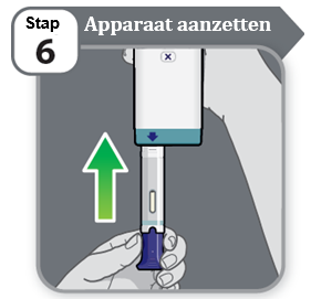 - Plaats het apparaat zo, dat de blauwe pijl in een hoek van 90 graden (rechte hoek) naar de injectieplaats wijst.