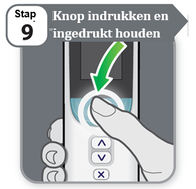 - Druk de injectieknop in en houd hem ingedrukt om de injectie te starten als op het display staat aangegeven dat u dit moet doen.