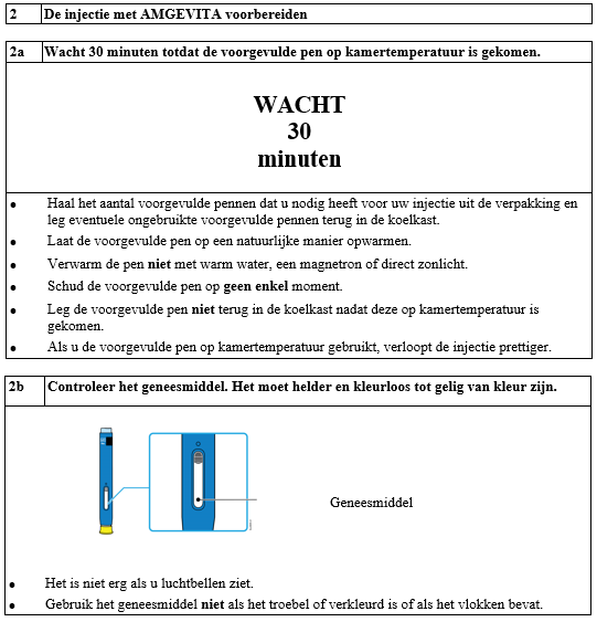Een AMGEVITA voorgevulde pen voor eenmalig gebruik mag bewaard worden bij een temperatuur tot maximaal 25°C gedurende maximaal 14 dagen. De voorgevulde pen moet worden beschermd tegen licht en worden afgevoerd als deze niet binnen de periode van 14 dagen wordt gebruikt.