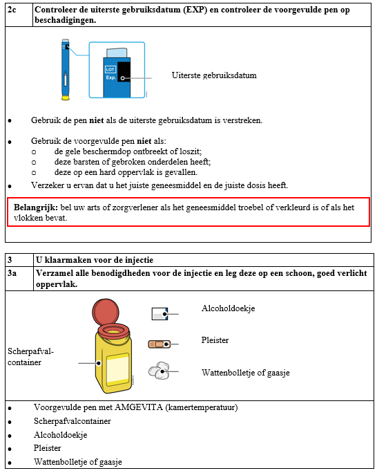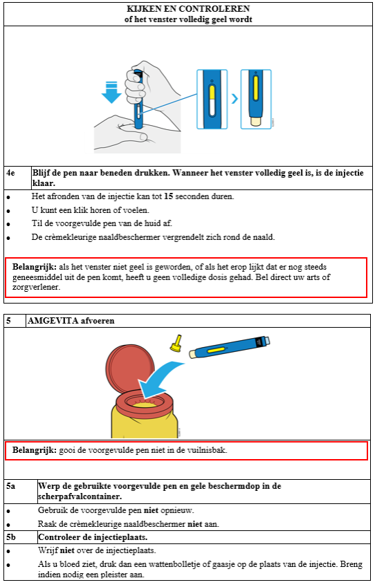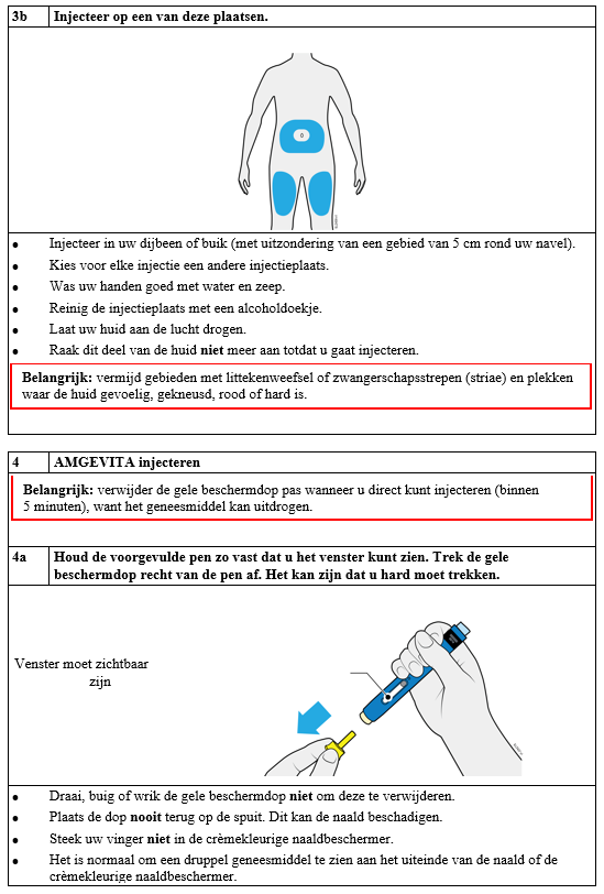 - Als u allergische reacties met klachten als benauwdheid, piepende ademhaling, duizeligheid, zwelling of uitslag krijgt, injecteer dan geen AMGEVITA meer, maar neem direct contact op met uw arts aangezien deze reacties, in zeldzame gevallen, levensbedreigend kunnen zijn.