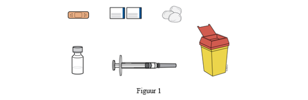 Leg alles wat u nodig heeft bij elkaar op een schoon oppervlak. Dat zijn: een spuit, naald, ontsmettingsdoekjes, een watje of katoenen gaasje en een naaldenbox (zie figuur 1).