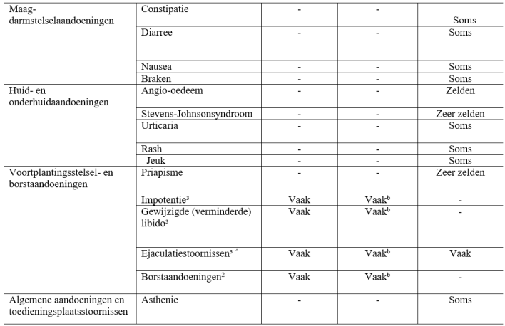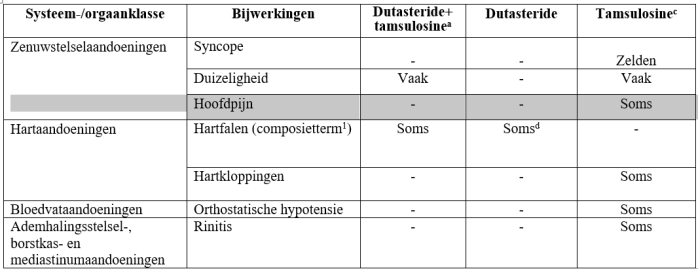 - Dutasteride + tamsulosine: van de CombAT-studie - de frequenties van bijwerkingen dalen mettertijd van jaar 1 tot jaar 4.
