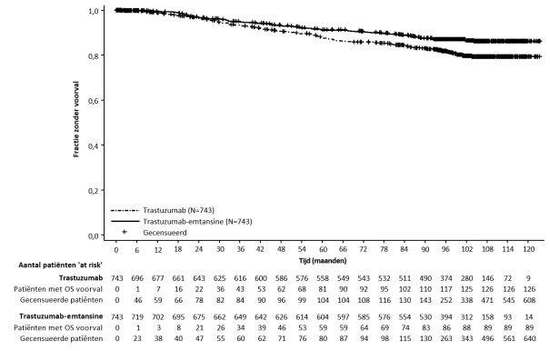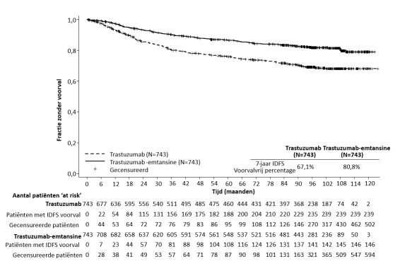 Tabel 3 geeft de samengevoegde data weer van de totale behandelingsperiode in de onderzoeken naar gemetastaseerde borstkanker (N = 1. 871; mediane aantal cycli van trastuzumab-emtansine was 10) en KATHERINE (N = 740; mediane aantal cycli van trastuzumab-emtansine was 14).
