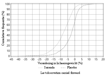 Behandeling met Saxenda moet worden gestaakt als de patiënt na 12 weken gebruik van de dagdosering van 3,0 mg niet ten minste 5% van zijn aanvankelijke lichaamsgewicht is kwijtgeraakt.