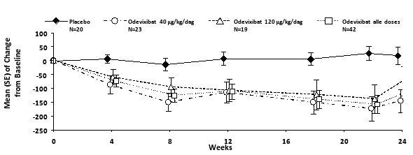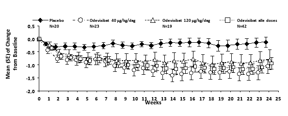 Na aanvang van de behandeling met odevixibat kan bij sommige patiënten geleidelijk een verbetering in pruritus en een daling van het serumgalzuur optreden. Als na drie maanden ononderbroken behandeling geen adequate klinische respons is bereikt, kan de dosis worden verhoogd tot 120 μg/kg/dag (zie rubriek 4.4).
