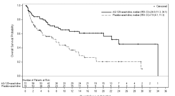 In onderzoek AG120-C-009 werd bij 21% van de 72 patiënten met nieuw gediagnosticeerde AML die met ivosidenib in combinatie met azacitidine werden behandeld elektrocardiogram QT verlengd gemeld; 11% ervoer reacties van graad 3 of hoger. Op basis van de analyse van de ECG’s bleek 15% van de patiënten die met ivosidenib in combinatie met azacitidine werden behandeld, die minstens één ECG-beoordeling na de baseline hadden, een QTc-interval > 500 ms te hebben en had 24% een toename vanaf baseline-QTc van ˃ 60 ms. Eén procent (1%) van de patiënten beëindigde de behandeling met ivosidenib als gevolg van elektrocardiogram QT verlengd. Dosisonderbreking en ‑verlaging waren vereist bij respectievelijk 7% en 10% van de patiënten. De mediane tijd tot aanvang van QT-verlenging bij met ivosidenib behandelde patiënten was 29 dagen. Elektrocardiogram QT verlengd kwam tussen 1 dag en 18 maanden na instelling van de behandeling op.