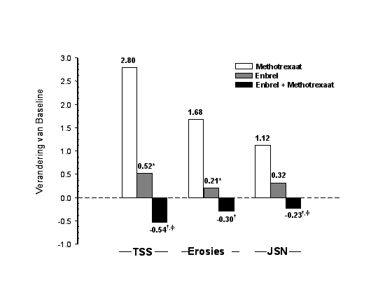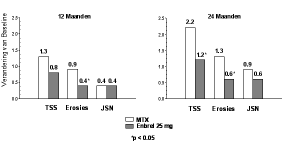 Het is gebleken dat Enbrel, zowel op zichzelf gebruikt als in combinatie met methotrexaat, de progressiesnelheid van gewrichtsschade, zoals deze door middel van röntgenonderzoek gemeten wordt, reduceert en het lichamelijk functioneren verbetert.