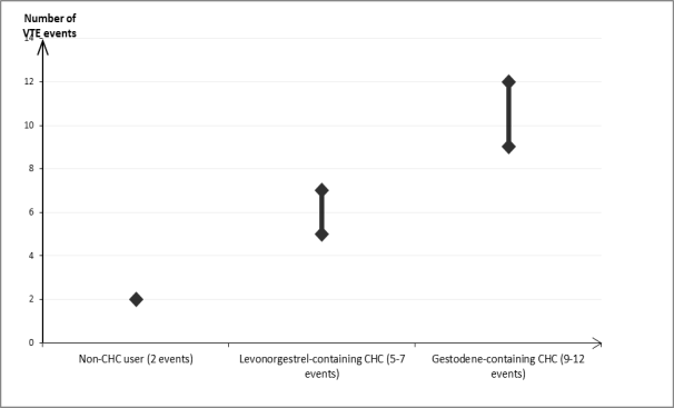 [2] Middelste punt van het bereik ('mid-point of range') van 5‑7 per 10.000 vrouwjaren, op basis van een relatief risico voor levonorgestrelbevattende gecombineerde hormonale anticonceptiva versus niet-gebruik van ongeveer 2,3 tot 3,6