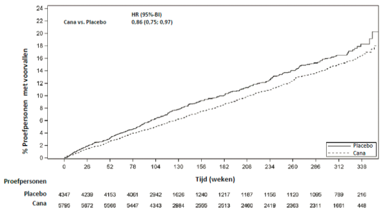 Er was geen verschil in risico op amputatie van de onderste ledematen gerelateerd aan het gebruik van 100 mg canagliflozine ten opzichte van placebo (respectievelijk 1,2 versus 1,1 voorvallen per 100 patiëntjaren [HR: 1,11; 95%-BI 0,79; 1,56]) in CREDENCE, een langetermijnstudie naar nieruitkomsten bij 4.397 volwassen patiënten met type 2-diabetes en diabetische nierschade (zie rubriek 4.4). In andere studies met canagliflozine bij type 2-diabetes, waarin een algemene diabetische populatie van 8.114 volwassen patiënten werd geïncludeerd, werd geen verschil in risico op amputatie van de onderste ledematen waargenomen ten opzichte van controlepatiënten.