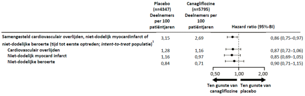 De veiligheid van canagliflozine werd beoordeeld bij 22.645 volwassen patiënten met type 2‑diabetes, waaronder 13.278 patiënten behandeld met canagliflozine en 9.367 patiënten met de comparator in 15 dubbelblinde, gecontroleerde klinische fase III‑ en fase IV-studies. In totaal werden 10.134 volwassen patiënten behandeld in twee specifieke cardiovasculaire studies gedurende een blootstellingsduur van gemiddeld 149 weken (223 weken in CANVAS en 94 weken in CANVAS-R) en werden 8.114 volwassen patiënten behandeld in 12 dubbelblinde, gecontroleerde klinische fase III- en fase IV-studies gedurende een blootstellingsduur van gemiddeld 49 weken. In een specifieke studie naar nieruitkomsten hadden in totaal 4.397 volwassen patiënten met type 2-diabetes en diabetische nierschade een blootstellingsduur van gemiddeld 115 weken.