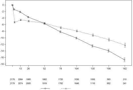Opmerking: de incidentie is gebaseerd op het aantal patiënten met ten minste één amputatie, niet op het totale aantal amputaties. De follow-up van een patiënt wordt berekend op basis van dag 1 tot de datum van de eerste amputatie. Sommige patiënten hadden meer dan één amputatie. Het percentage van kleine en grote amputaties is gebaseerd op het hoogste amputatieniveau bij elke patiënt. | ||