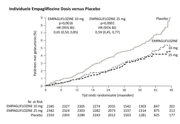 De glykemische werkzaamheid van empagliflozine is afhankelijk van de nierfunctie. Ter vermindering van het cardiovasculaire risico dient als aanvulling op de standaardzorg een dagelijkse dosis van 10 mg empagliflozine te worden toegepast bij patiënten met een eGFR onder 60 ml/min/1,73 m2 (zie tabel 1). Omdat de glucoseverlagende werking van empagliflozine minder is bij patiënten met matige nierinsufficiëntie en bij patiënten met ernstige nierinsufficiëntie waarschijnlijk uitblijft, dient de toevoeging van andere antihyperglykemische middelen te worden overwogen als verdere glykemische regulering nodig is.