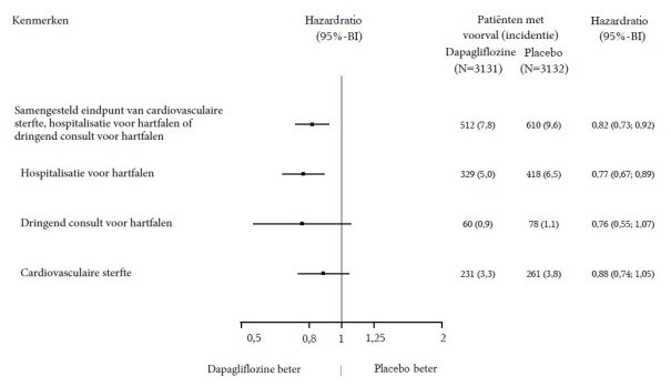 In de studie naar cardiovasculaire uitkomsten voor dapagliflozine bij patiënten met hartfalen met verminderde ejectiefractie (DAPA-HF-studie) werden 2.368 patiënten behandeld met dapagliflozine 10 mg en 2.368 patiënten met placebo met een mediane blootstellingsduur van 18 maanden. De patiëntenpopulatie bestond uit patiënten met diabetes mellitus type 2 en patiënten zonder diabetes en patiënten met eGFR ≥ 30 ml/min/1,73 m2. In de studie naar cardiovasculaire uitkomsten voor dapagliflozine bij patiënten met hartfalen met linkerventrikelejectiefractie > 40% (DELIVER), werden 3.126 patiënten behandeld met dapagliflozine 10 mg en 3.127 patiënten met placebo met een mediane blootstellingsduur van 27 maanden. De patiëntenpopulatie bestond uit patiënten met diabetes mellitus type 2 en zonder diabetes, en patiënten met eGFR ≥ 25 ml/min/1,73 m2.