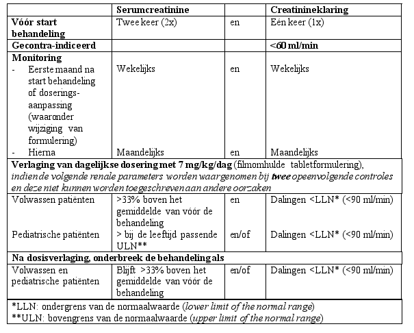 Aanhoudend >2.500 µg/l en geen dalende trend in de tijd | Verhoog de dosis elke 3 tot 6 maanden in stappen van 3,5 tot 7 mg/kg/dag. |