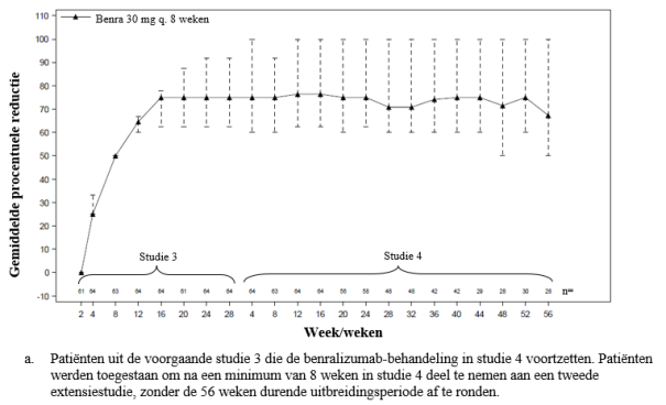 De aanbevolen dosering van benralizumab is 30 mg via subcutane injectie elke 4 weken.