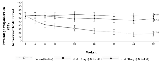 Bij patiënten die na 12 weken behandeling geen tekenen vertonen van therapeutisch voordeel, moet staken van de behandeling met upadacitinib worden overwogen.
